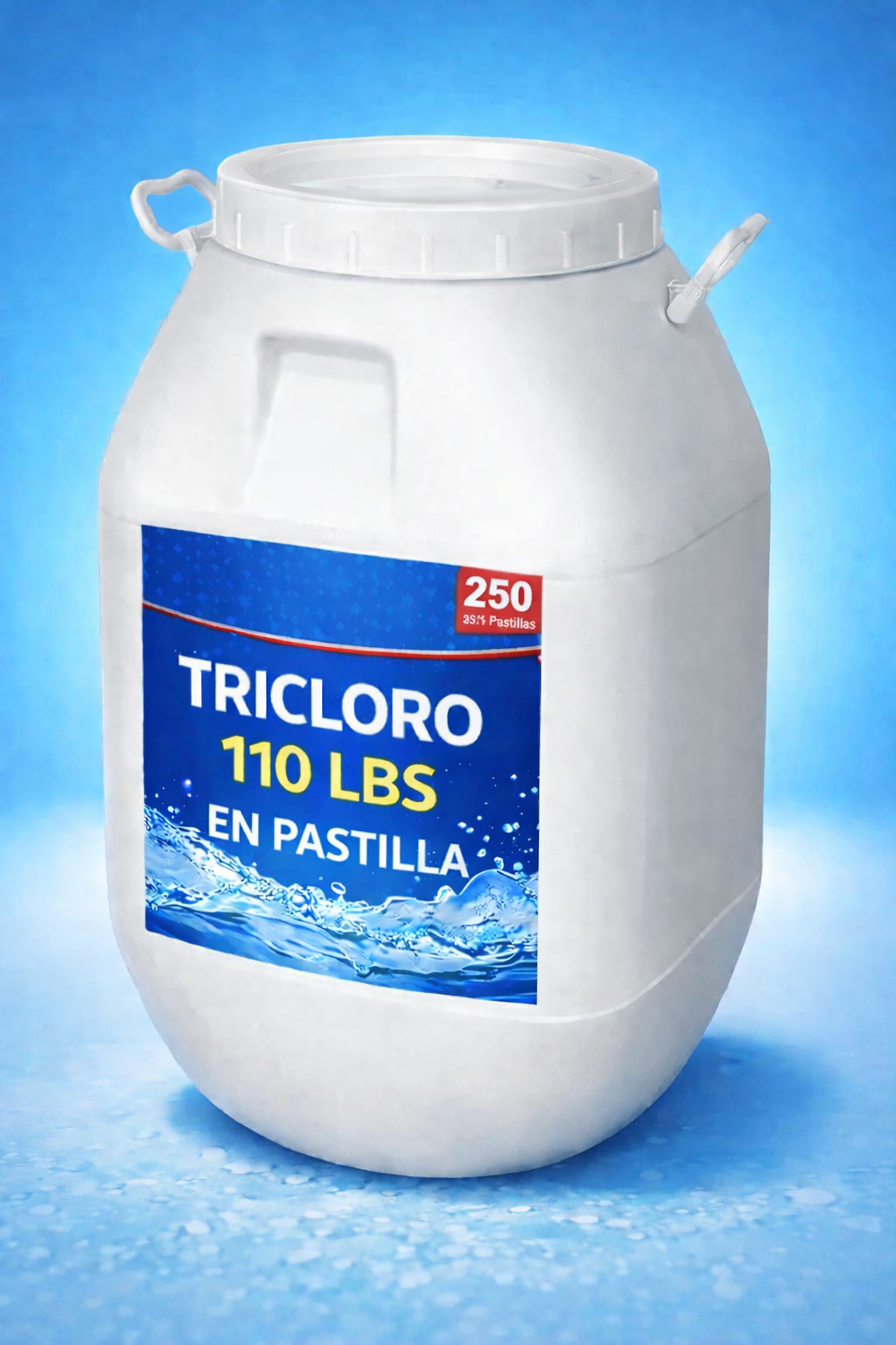 Producto clorado de alta concentración diseñado para la desinfección y mantenimiento prolongado de agua. Cada unidad consiste en un envase de 110 libras (50 kg) que contiene 250 pastillas individuales, selladas en empaque tipo blíster para garantizar la seguridad en el manejo, evitar la humedad y reducir la emisión de vapores corrosivos durante el almacenamiento.